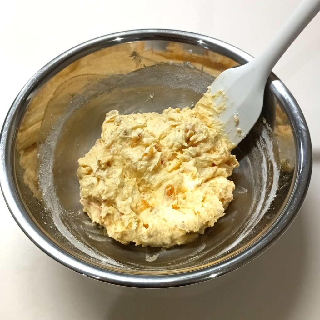 - 泡立て器やハンドミキサーで混ぜると焼いたとき膨らみが良くなりますが、混ぜる時けっこう大変なのでへらで大丈夫です。(マーガリンが飛びちったり、やたら羽根にまとわりついたりする)