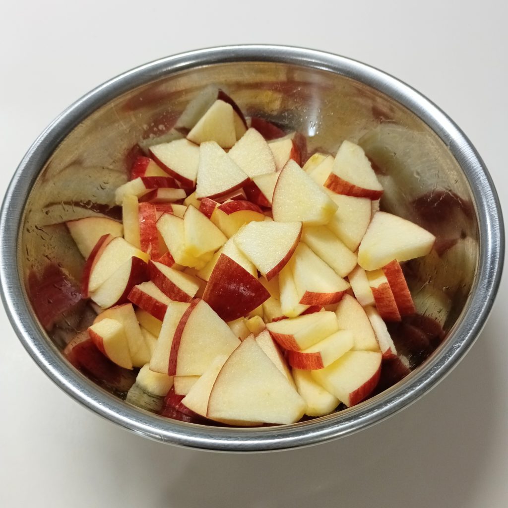 りんごを8等分にして芯を取り、厚さ約5mmのいちょう切りにしてからレモン果汁とラム酒をまぶします。
