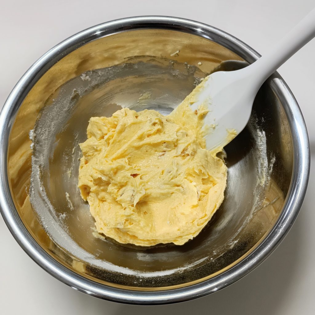 - 泡立て器やハンドミキサーで混ぜると焼いたとき膨らみが良くなりますが、混ぜる時けっこう大変なのでへらで大丈夫です。(マーガリンが飛びちったり、やたら羽根にまとわりついたりする)