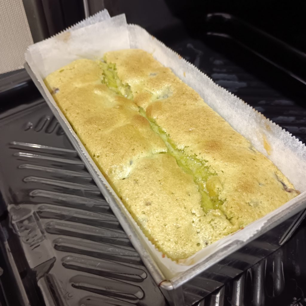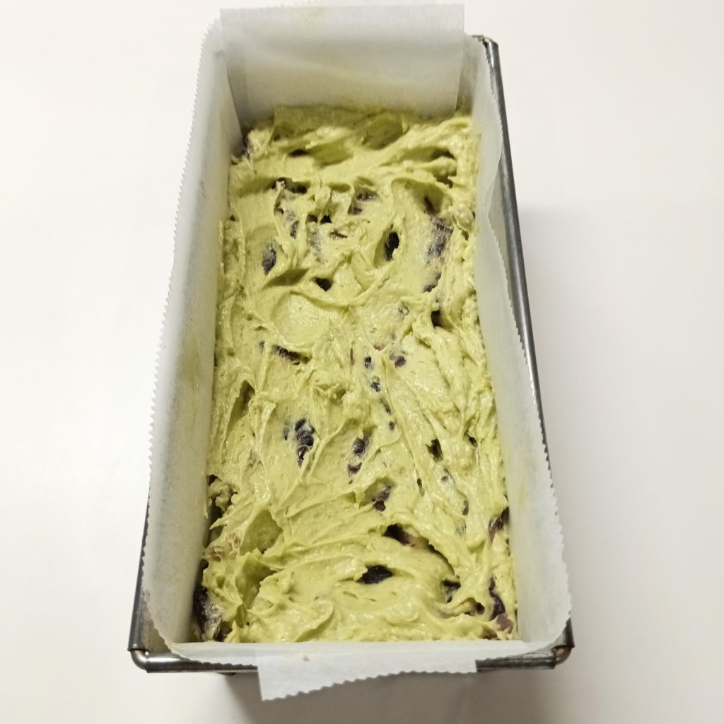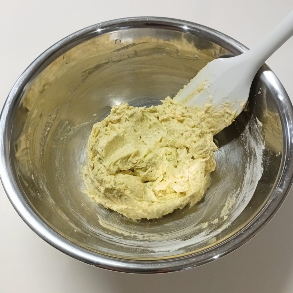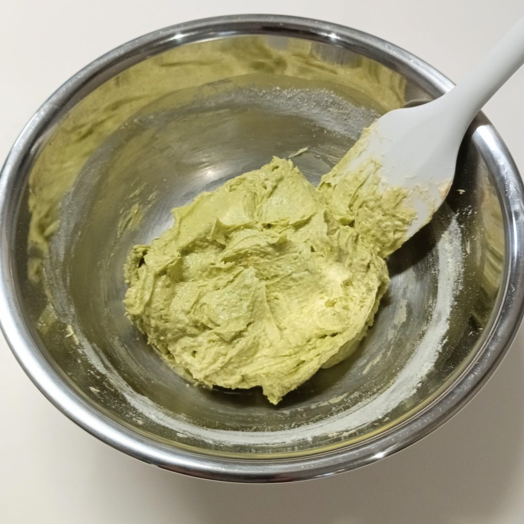 ふるっておいた薄力粉、アーモンドプードル、抹茶、ベーキングパウダーの1/2を入れて混ぜます。