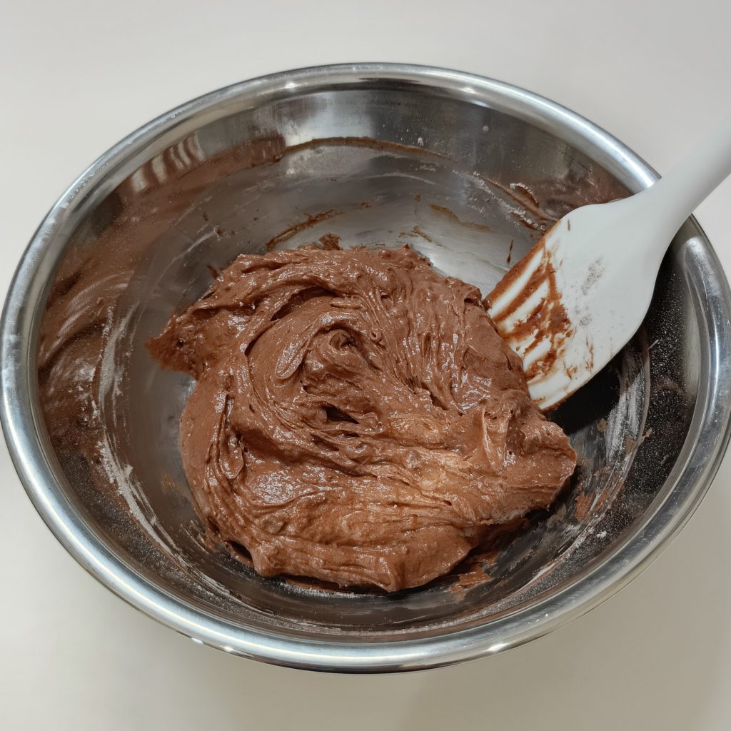ふるっておいた薄力粉、ココアパウダー、ベーキングパウダーの1/2を入れて混ぜます。