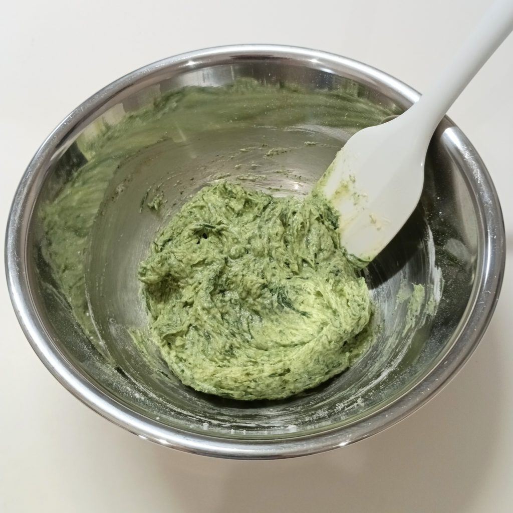 牛乳とよもぎの1/2 → 残りの粉類の1/2 → 残りの牛乳とよもぎ全部 → 残りの粉類全部