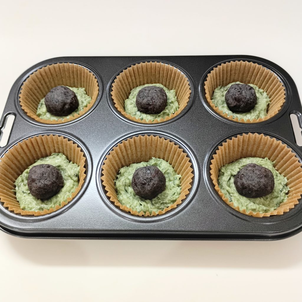 スプーンなどを使って型に生地を1cmくらいの厚さに入れ、その上にあんこ玉を乗せます。