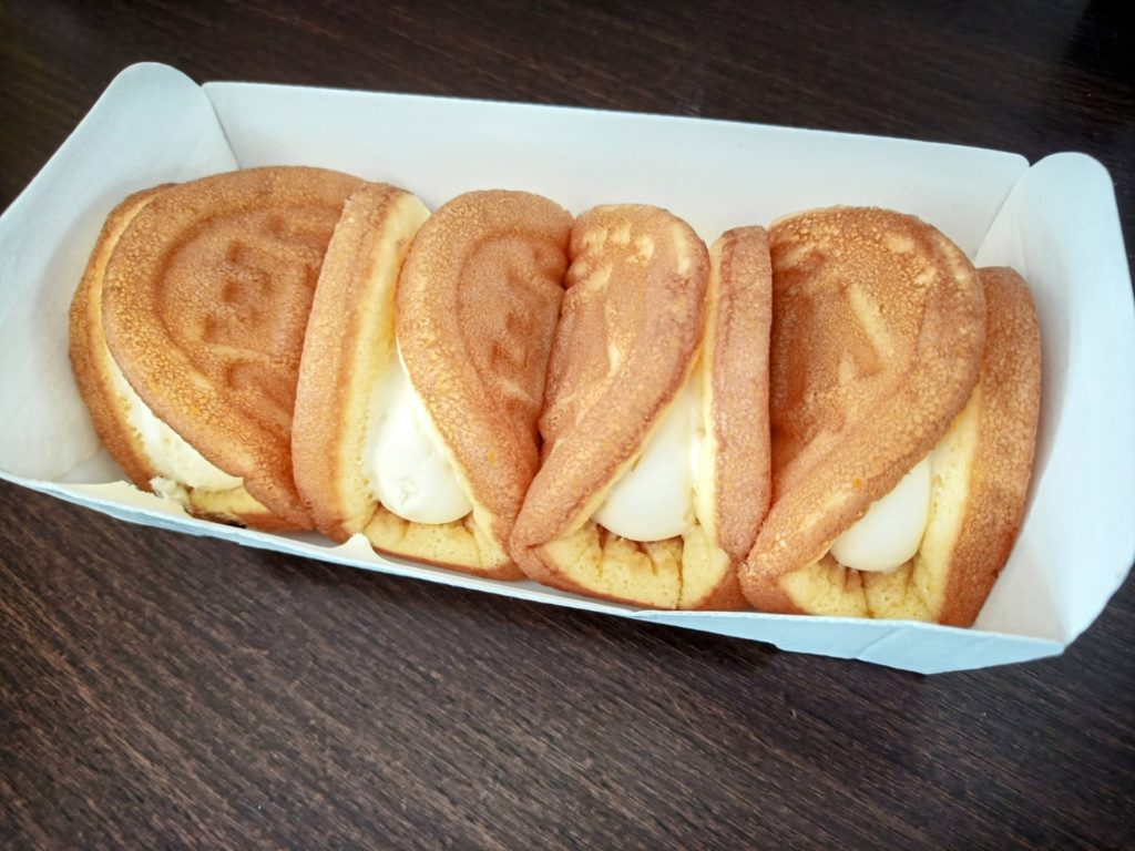 生地は甘さ控えめで、クリームなんかをトッピングして食べます。形は長方形。